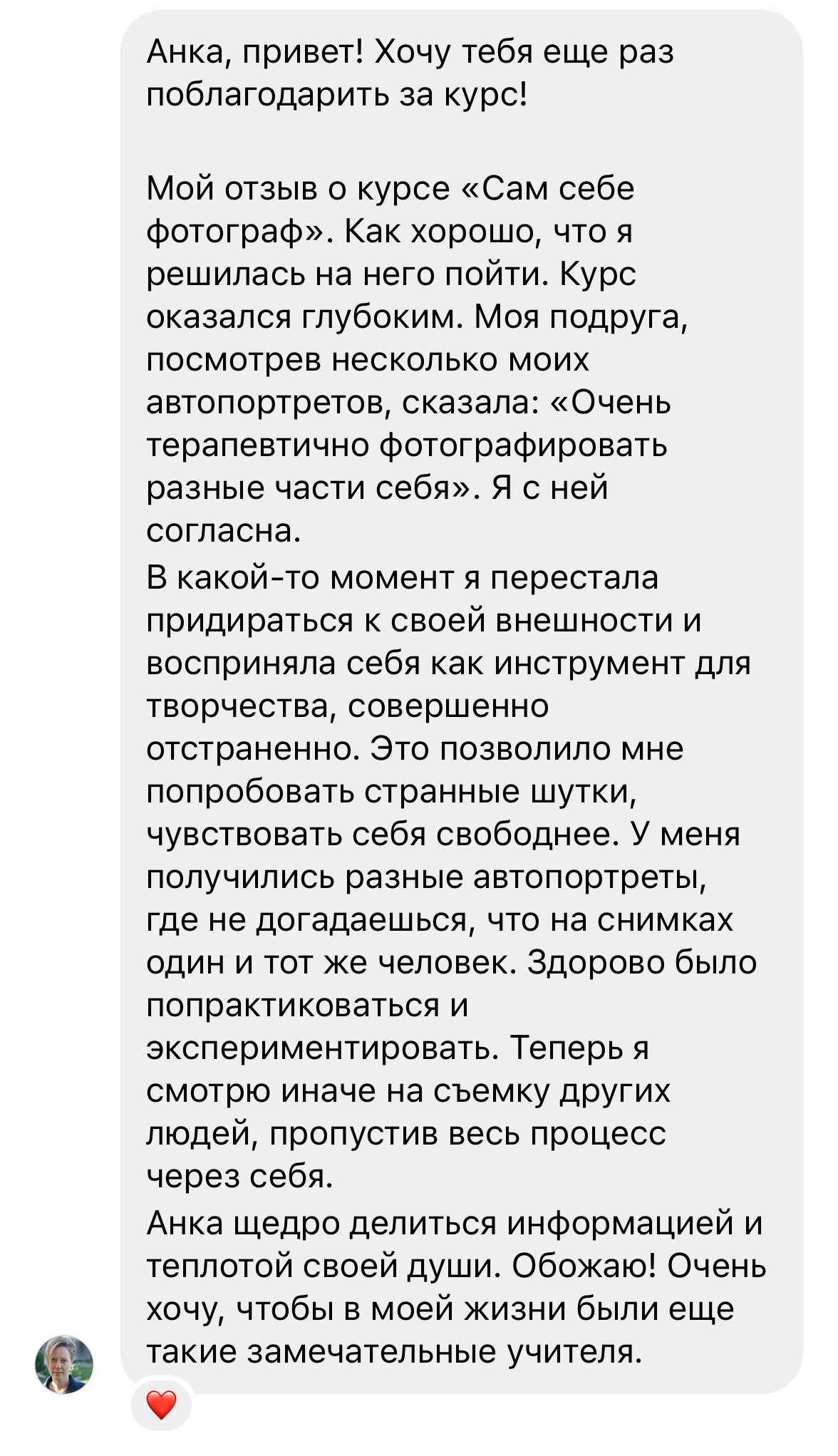 Этот курс научит вас делать автопортреты, принимать и любить себя в кадре. А главное — этот опыт поможет вам лучше фотографировать других [https://www.anka-zhuravleva.com/sama-sebe-fotograf-page]